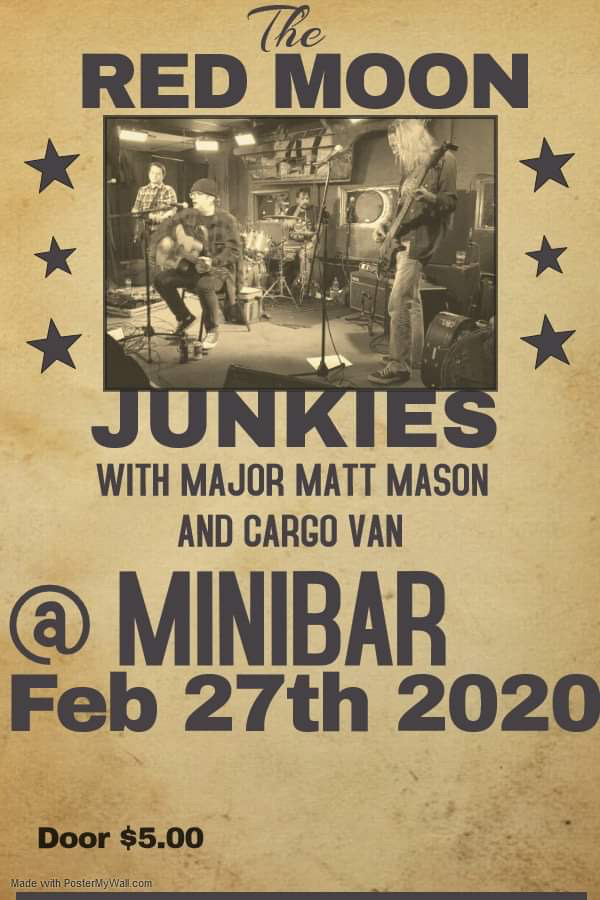 February 22, 2020 majormattusa Next Major Matt Mason USA (band) Show: Thursday Feb. 27th @ miniBar in KC, MO w/ Red Moon Junkies + Cargo Van FB Event Share this: Click to share on X (Opens in new window) X Click to share on Facebook (Opens in new window) Facebook Like Loading... Related