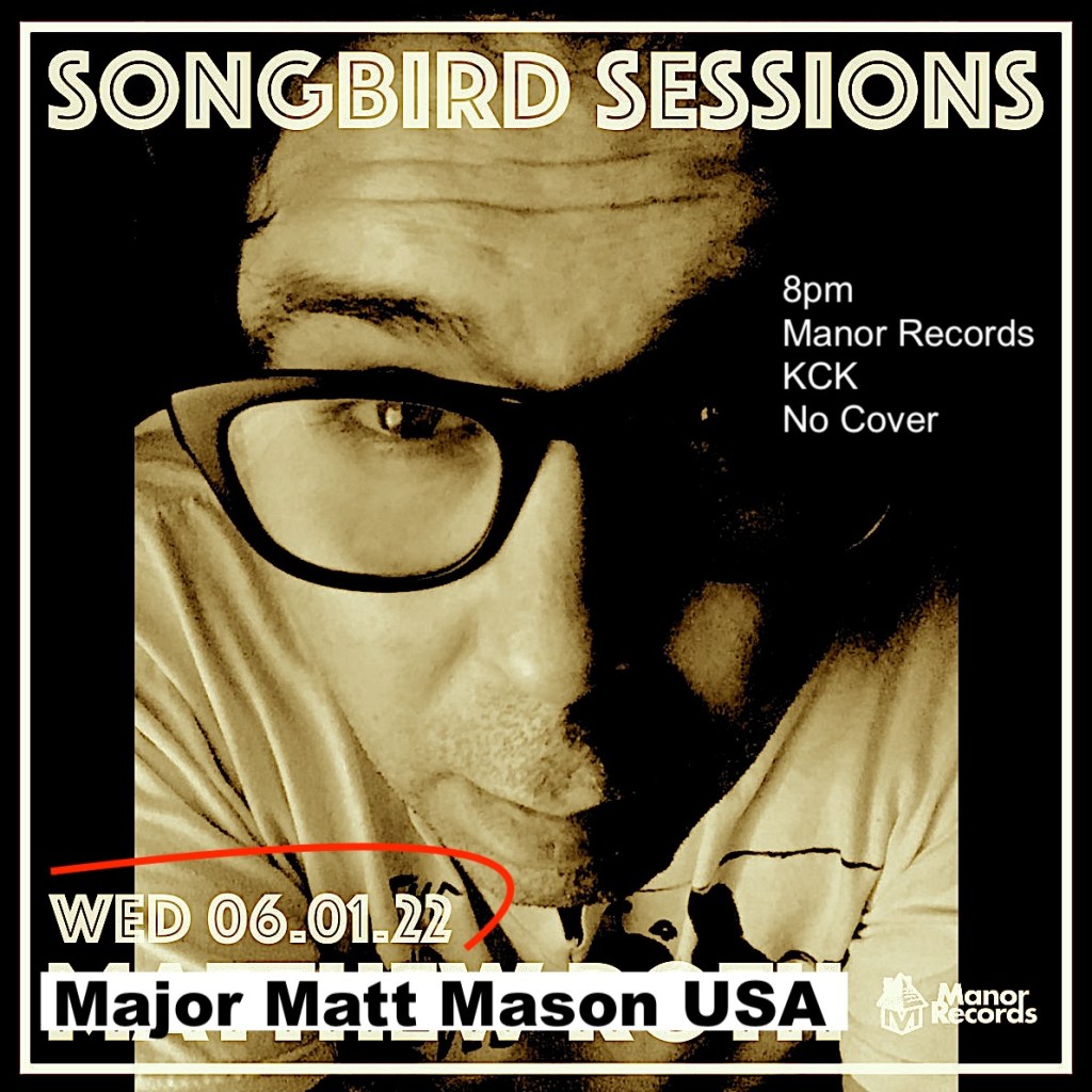 May 29, 2022 majormattusa Wednesday, June 1st / Major Matt Mason USA (Solo) “Songbird Sessions” @ Manor Records (KC, KS) 2 Sets. 1 acoustic. 1 electric. Just me. 8pm sharp/ No Cover https://fb.me/e/3hhrwOSwN Share this: Click to share on X (Opens in new window) X Click to share on Facebook (Opens in new window) Facebook Like Loading... Related